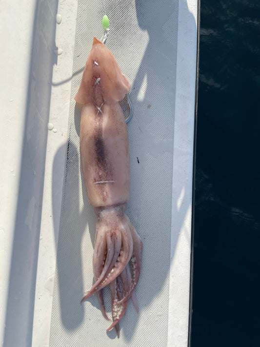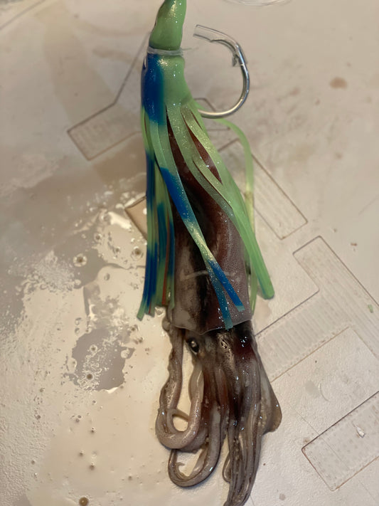 Our OG bait is the classic 11/0 Southern tuna J hook rigged in a premium Surume squid. This is one of our most popular baits and is also offered with a lumo skirt for added protection.